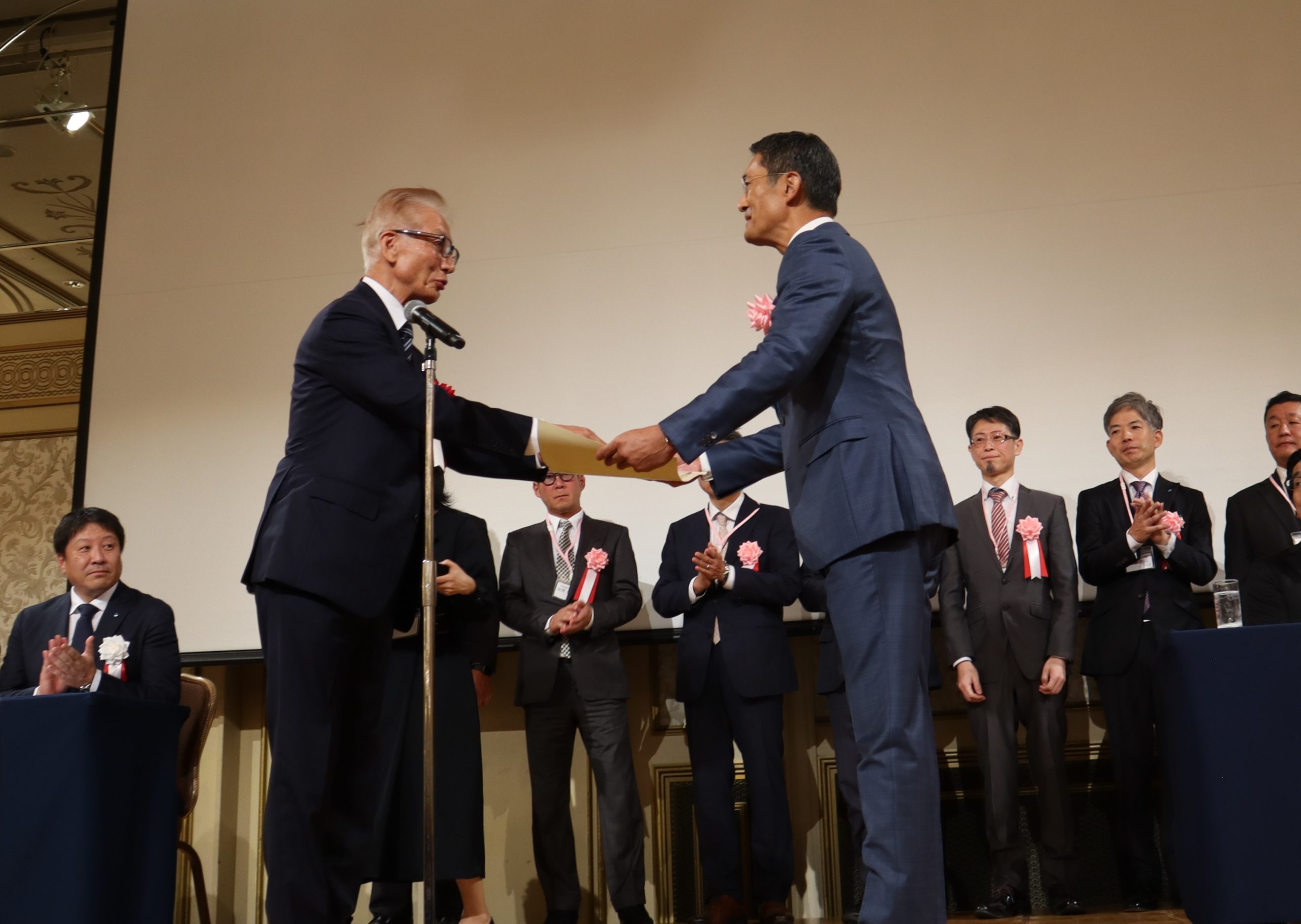 オープニングビデオの放映で式典が始まり、丹羽青連協会長のあいさつ、安藤県連会長のあいさつの後、安藤県連会長から、第30代から第40代の青連協会長に対して、感謝状が授与されました。最後に、ご来賓の名古屋国税局課税第二部長の嶋橋様と全法連青連協会長の大貫様からそれぞれご祝辞をいただき、滞りなく式典は終了しました。