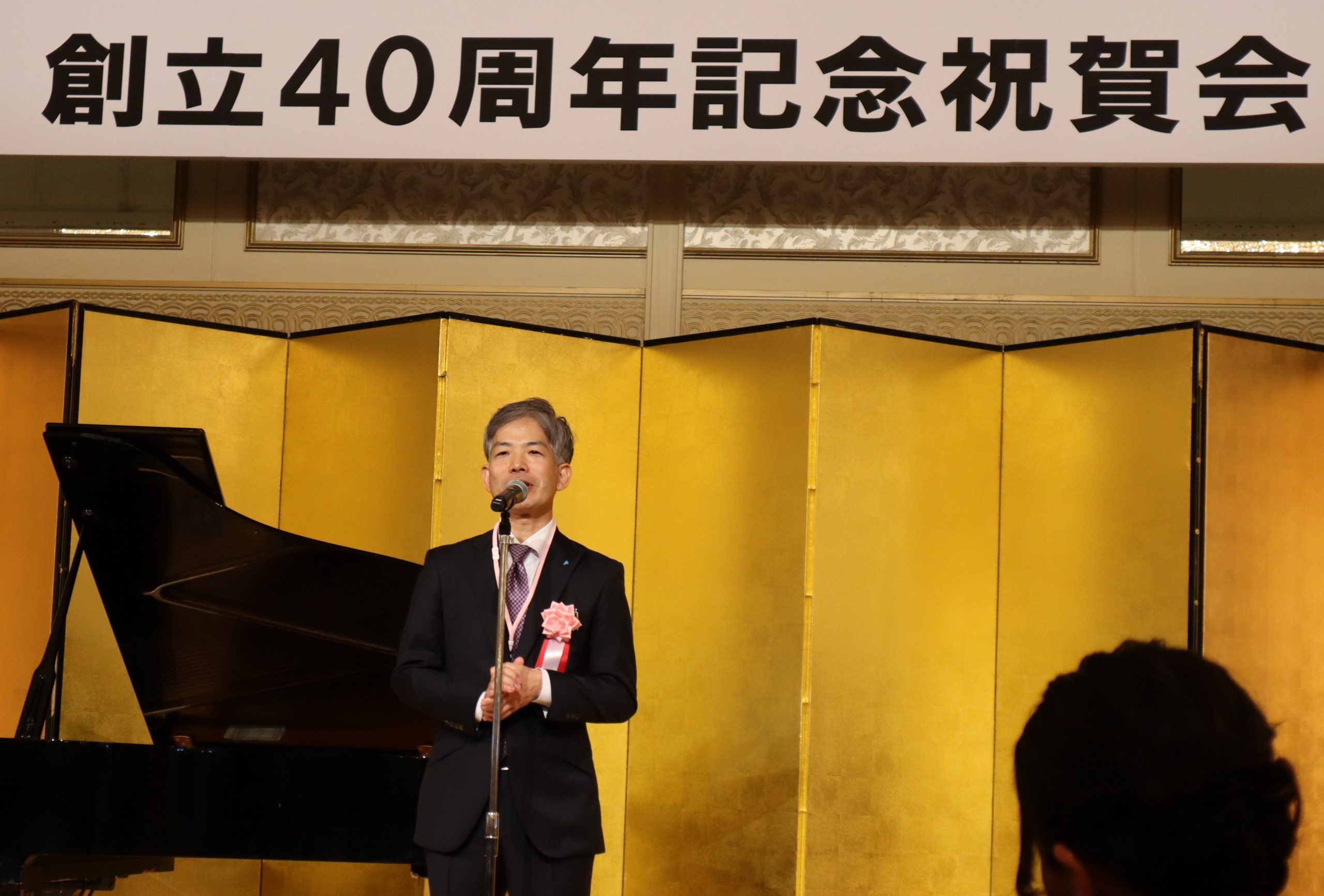 講演会後、会場をルネッサンスの間に移して記念祝賀会が開催され、山田実行委員長のあいさつの後、青連協の生みの親である設立準備委員の西村様と川村様が紹介され、お二人とともに鏡開きの後、鈴木県連副会長による乾杯の発声により、祝宴が始まりました。ヴァイオリンとピアノの演奏のアトラクションで盛り上がり、後藤青連協監事の中締めにより、祝賀会は盛会裏に終了いたしました。