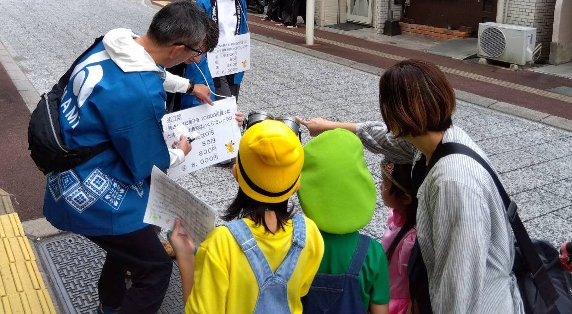 税金の仕組みや使い道を楽しく学んでもらおうと実施。商店街秋祭りの中でたくさんの小学生や親子で参加して頂きました。