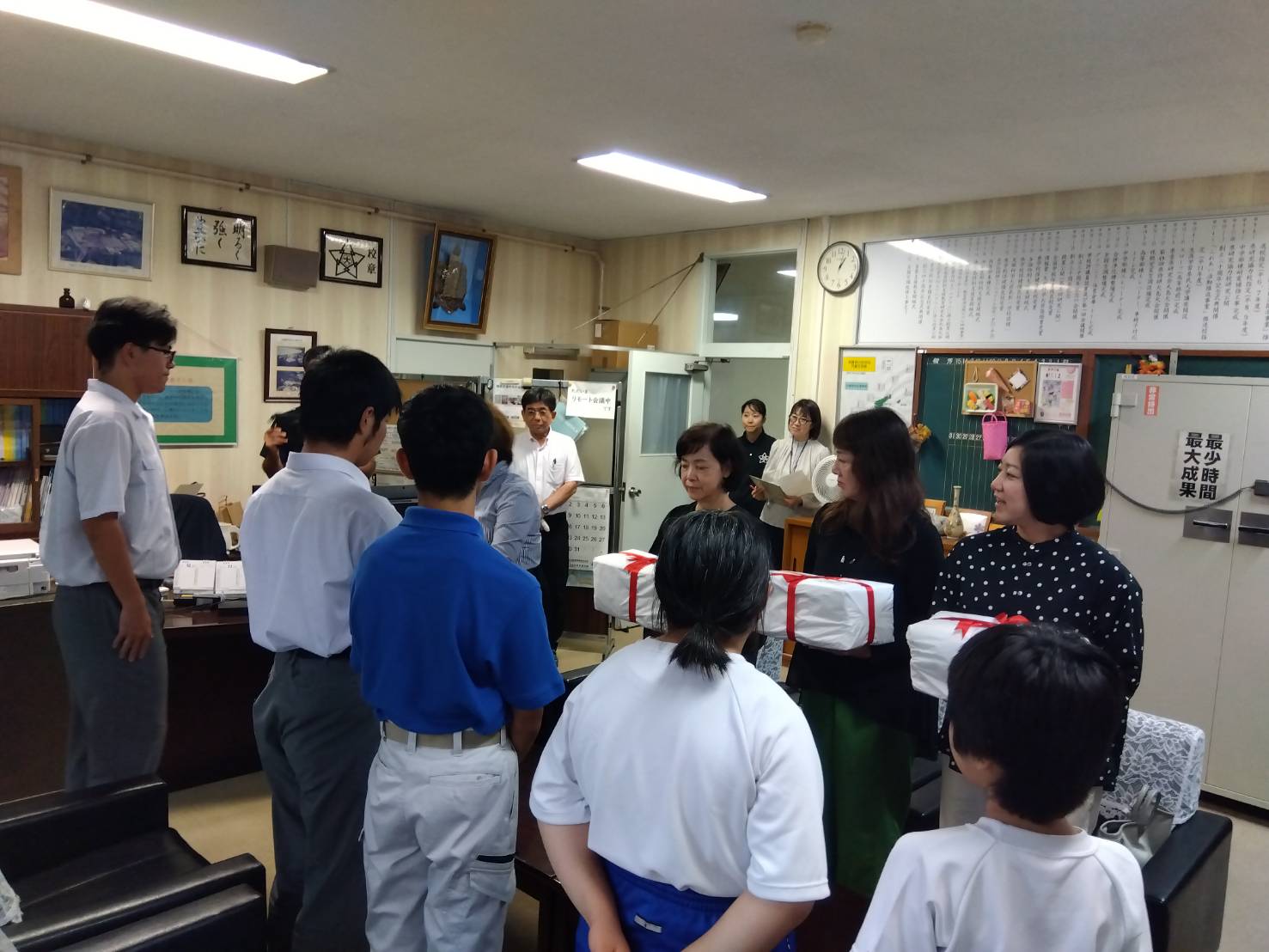 女性部会は、11月 2日に大和中学校に手作り雑巾の贈呈式を行いました。その他大和村内小中学校や宇検村内小中学校へもそれぞれ雑巾を贈呈致しました。