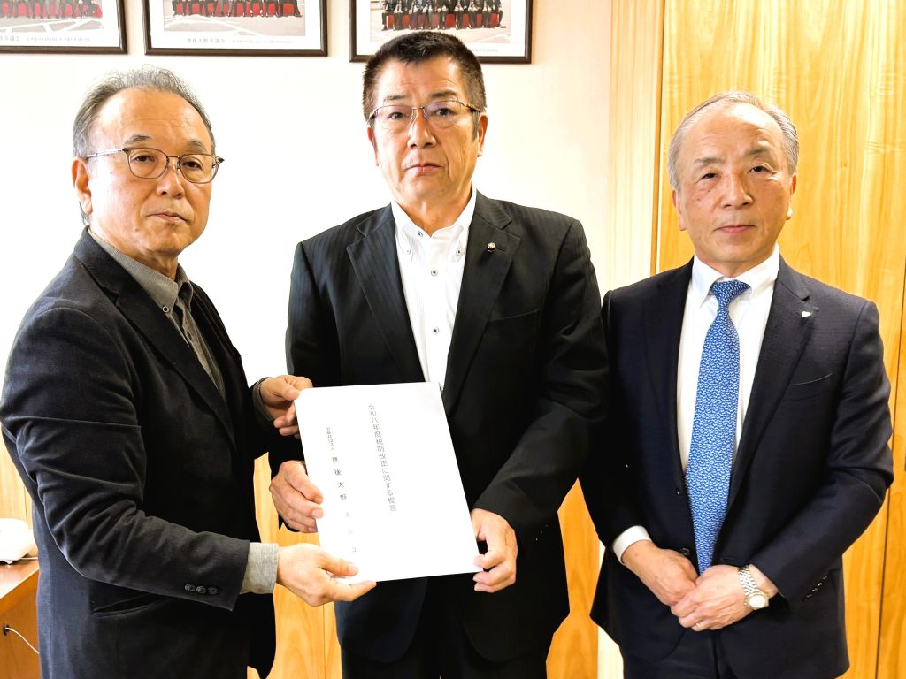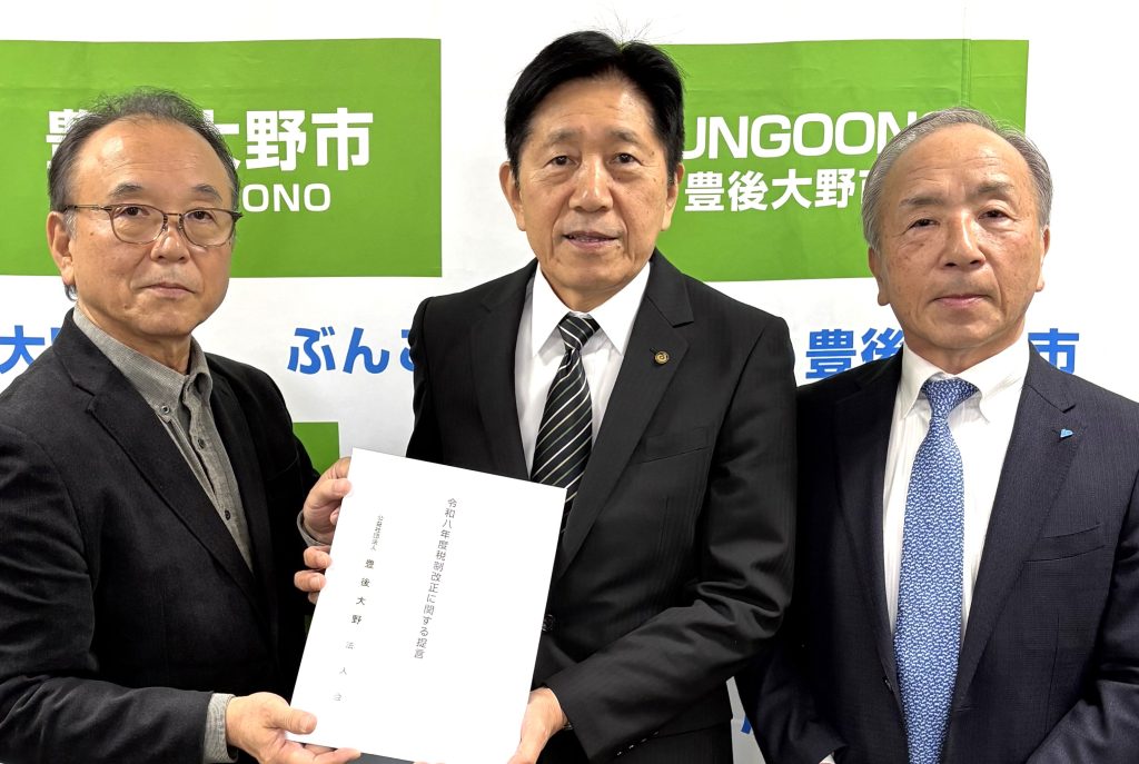 令和6年11月28日 当会江藤会長と矢野税制委員長が豊後大野市役所へ伺い、豊後大野市長、豊後大野市議会議長へ令和7年度税制改正に関する提言書を渡しました。全法連理事会で決議された「令和7年度税制改正に関する提言」事項について、毎年その実現に向け地方自治体に対して当会役員より提言活動を実施しております。