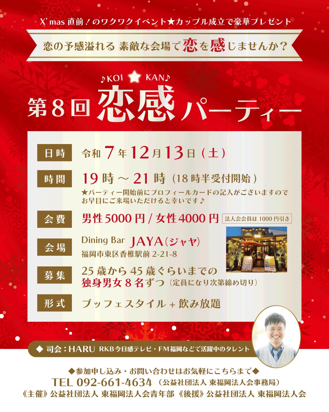 | 12月13日(土) | 19:00~21:00 | 第8回恋感パーティー | Dining Bar JAYA(福岡市東区) |