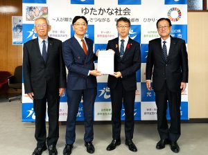 法人会では、毎年税制改正に関し、政府・政党・関係省庁等に対して建設的な意見を提言しその実現を訴えています。当会では、藤井会長、東税制委員長と西本総務委員長が芳岡光市長と森戸光市議会議長に面会し「令和8年度税制改正に関する提言」の趣旨を説明し、実現に向けての支援をいただくようお願い致しました。