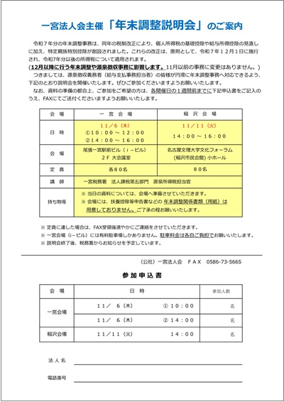 14:00 | 一宮商工会議所 | 年末調整と定額減税について 講師:一宮税務署 法人課税第1部門 統括国税調査官 久保 和巳 様 法人課税部門 源泉所得税担当官 様 |