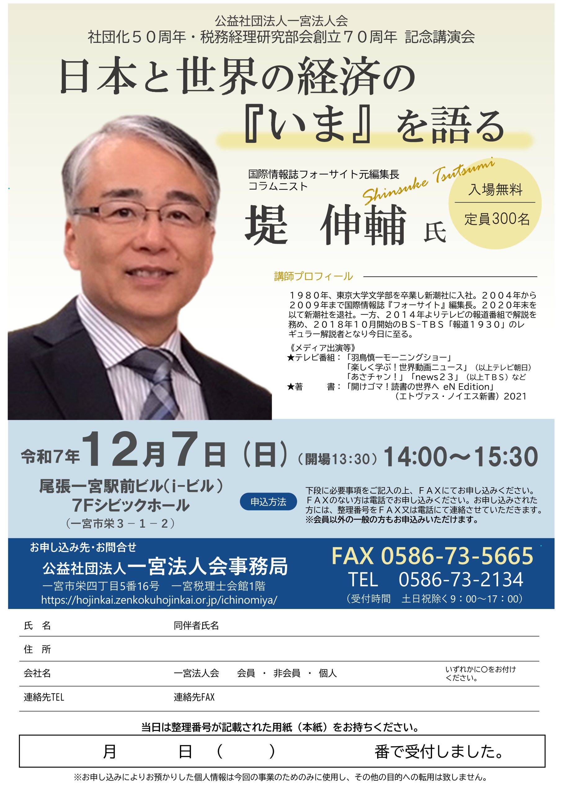 14:00 | 一宮市民会館 大会議室 | 令和7年度 税制改正(案)のポイント 講師:一宮税務署 法人課税第1部門 統括国税調査官 久保 和巳 様 審理担当国税調査官 河野 里紗 様 |
