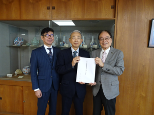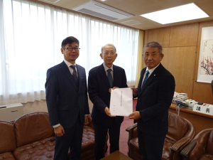 当法人会、税制委員会前田委員長より「令和8年度税制改正に関する提言書」を深浦伊万里市長と中山市議会議長に手渡し、提言内容についての実現に向けて格別な配慮を要望いたしました。