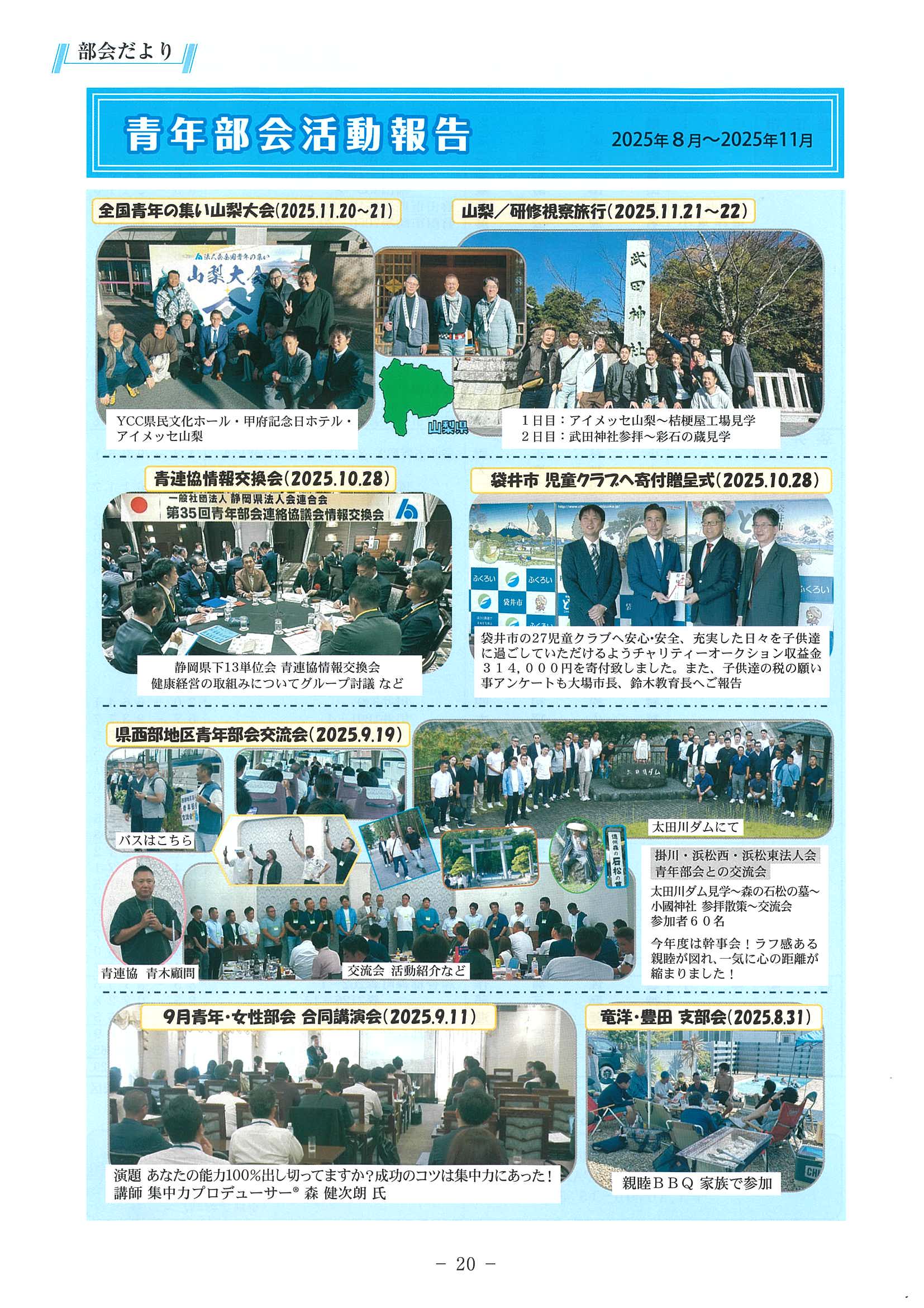 公益社団法人磐田法人会青年部会は、磐田市・袋井市・周智郡森町に在る磐田法人会の会員企業の50歳までの若手経営者及び後継者達で組織される団体で、磐田法人会の一部会として活動しており、創立から40年以上の長い歴史と実績を積み重ねてまいりました。