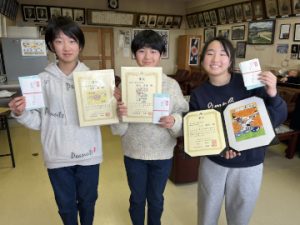 岡本 寛法人会会長が気仙沼小学校を訪ね、会長賞・優秀賞・審査員特別賞の受賞者に表彰状と記念品を贈呈しました。