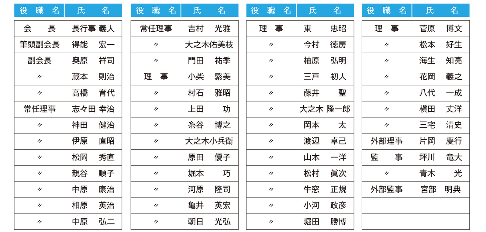 常任理事 羽田憲弘、得能宏一、榎 博司、小谷典臣、賀谷隆太郎、田中利幸、亀山博司、伊原直昭、神津善三朗、古本やゑ子、