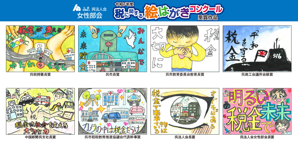 呉法人会女性部会では、小学生への租税教育活動として、毎年、「税に関する絵はがきコンクール」を実施しています。呉市内の小学6年生を対象に、租税教室などを通じて、児童に”税の大切さ”や”税の果たす役割”について学んでもらい、その知識や感想を”絵はがき”にすることで、税に対する理解をより深めてもらうことが目的です。令和7年度の入賞作品をご紹介します。