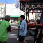 毎年、中津を代表する夏祭りの一つである、中津祇園期間中に「いちごプロジェクト」の節電うちわを配布しています。今年は7月26日、福沢通りが歩行者天国になるのに合わせ、中津税務署長をはじめ職員の方もご参加いただき、女性部会員とともに活動しました。山車が勢ぞろいした通りで「暑いですね」「無理のない範囲で節電にご協力をお願いします」と呼びかけながら配布をおこないました。