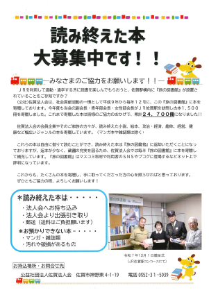 佐賀法人会では、社会貢献活動の一環として、佐賀へ通勤通学される方や旅行で佐賀へお越しになる方へご利用いただきたくJR佐賀駅の「旅の図書館」へ読み終わった本(マンガ・雑誌除く)を寄贈しております。くわしくはチラシをご覧ください。ご協力よろしくお願いします。