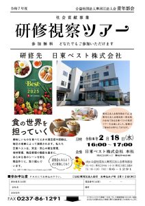 寒河江法人会青年部会では、当寒河江法人会塚田莊一郎会長の会社である日東ベストの見学ツアーを企画しました。皆様のご参加をお待ちしております。