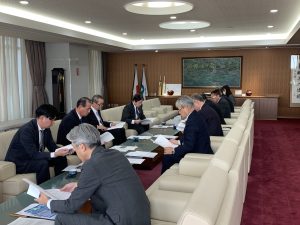左より:小田総合政策部長、津布久教育長、神宮次副議長、金子市長、金子会長、人見副会長、神山税制委員長、田澤税制副委員長 |