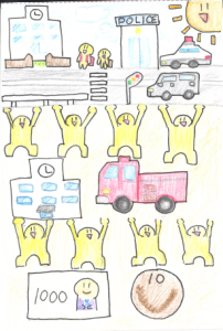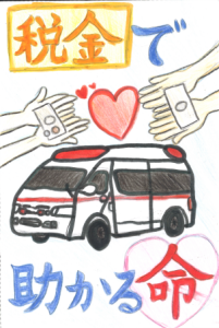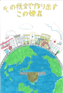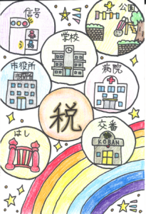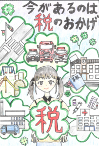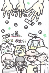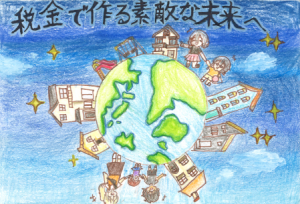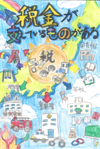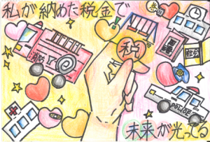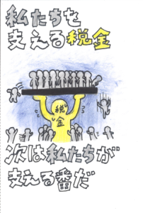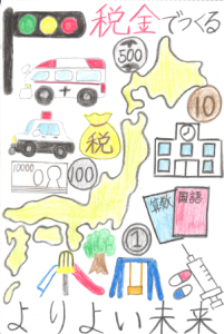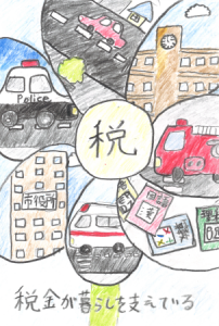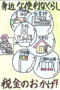 子どもたちは税に対する理解が出来ているように感じます。税がなぜ必要なのか?税はこんな働きをしているということを知らせてあげようとの気持ちを絵で表現してみると良いのではないでしょうか。根をつめて書いた作品は見ればわかりますので、頑張って書いてみてください。 |