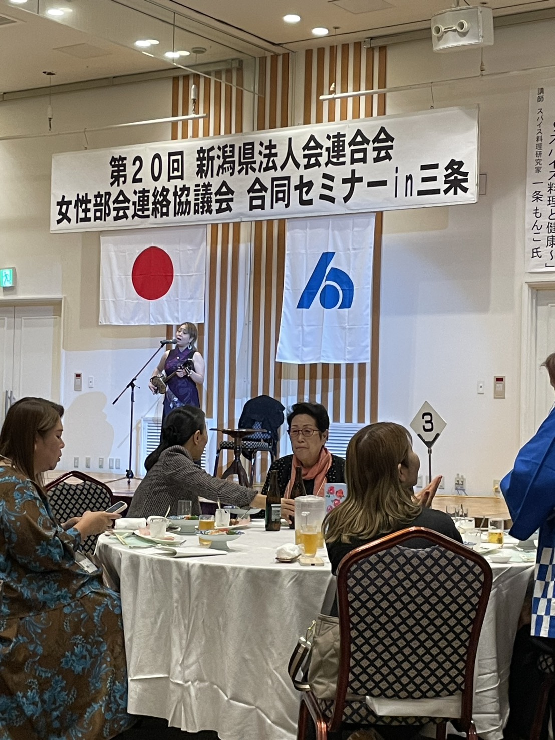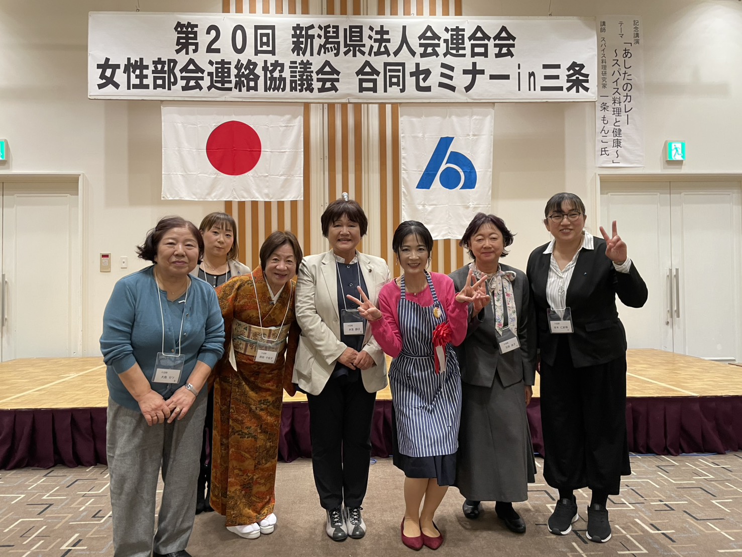 令和7年10月24日(金)、新潟県法人会連合会女性部会連絡協議会「合同セミナー」が三条市の「ジオ・ワールド ビップ」で開催されました。当法人会からは水落女性部会長ほか女性部会員5名が参加しました。講演会は「あしたのカレー~スパイス料理と健康」と題し、スパイス料理研究家・日本カレー協議会会長の一条もんこ氏からご講演いただきました。その後の交流会では、地元のおもてなし料理に舌鼓を打ちつつ県内各地の女性部会員と活発に交流し、楽しい時間を過ごしてきました。