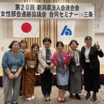 令和5年10月27日(金)、新潟県法人会連合会女性部会連絡協議会「合同セミナー」が新潟市「ANAクラウンプラザホテル新潟」で開催され、当法人会からは児玉女性部会長ほか6名が参加しました。式典後の講演会では「私とあなたのこころと心~備えておきたい介護の心得~」を演題に、一般社団法人新潟地域福祉協会 岡田 史理事長からご講演いただきました。また、交流会では次回大会開催地の高田法人会によるPRパフォーマンスがあり、会場は大いに盛り上がりました。