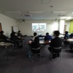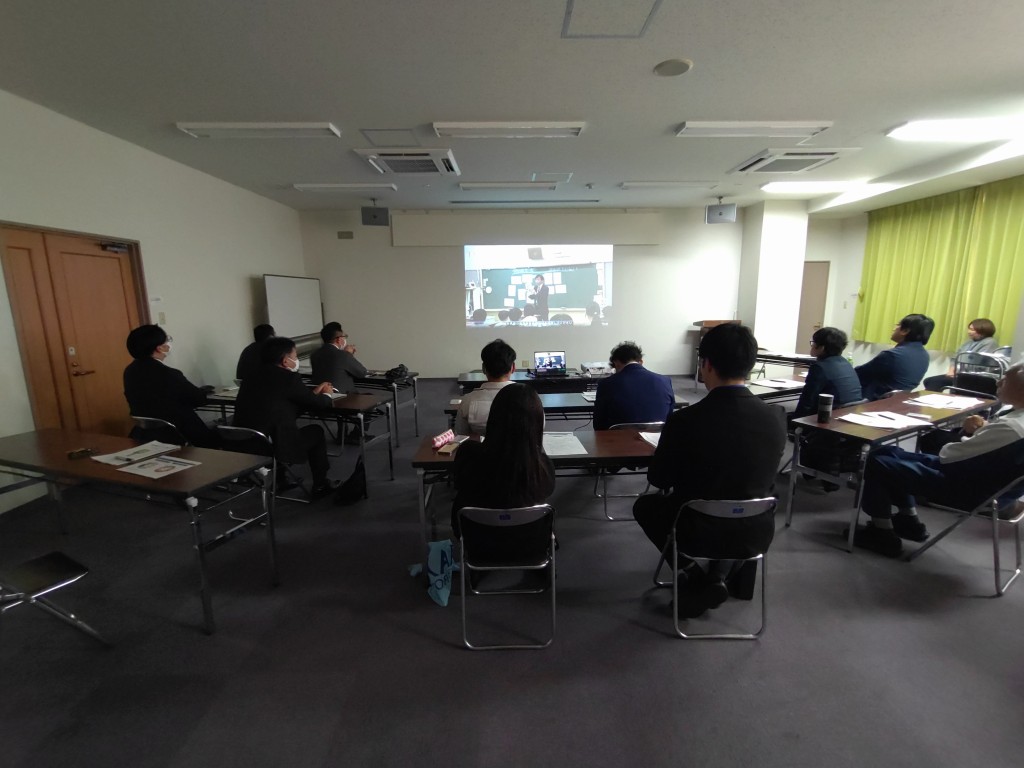 (写真は左から、司会の庭野幹事、藤田青年部会長の挨拶、動画視聴、坂井講師による講話)