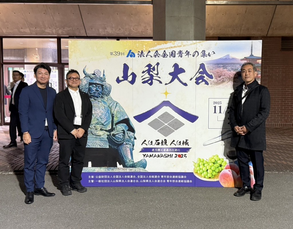 第39回法人会全国青年の集いが、令和7年11月20日(木)~21日(金)、山梨県甲府市の「アイメッセ山梨」等を会場に開催され、当法人会青年部会からは藤田満部会長、本木太一副部会長、長谷川吉徳副部会長の3名が参加しました。今回は「人は石垣 人は城 ~光り輝く未来のために~」を大会スローガンに、全国の青年部会員約1,900名が参加。法人会青年部会の柱の活動として取り組む「租税教育活動」と「健康経営」をテーマに活発な議論が行われるなど、各種会合が開催されました。記念講演会は(株)ヴァンフォーレ山梨スポーツクラブ代表取締役社長 佐久間悟氏を講師に、『「プロヴィンチア(地方クラブ)の挑戦」~フットボールクラブの枠を超えた存在と役割~』と題し、スポーツを通じた地域連携と健康経営の最前線についてご講演いただきました。21日の大懇親会では山梨の食と文化を大いに楽しみつつ、各地の会員との交流を深めて来ました。