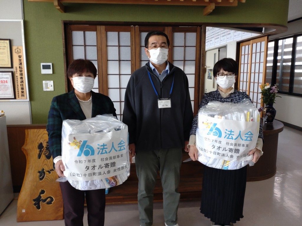 女性部会では平成14年より社会貢献活動として、女性部会員が持ち寄った未使用タオルを福祉施設等に寄贈しています。今年度は令和7年2月5日(水)に児玉さゆり部会長と水落静子副部会長が、社会福祉法人十日町福祉会が運営する特別養護老人ホーム三好園(みよしえん・下条3丁目)を訪問し、タオルと手ぬぐい160枚を寄贈しました。三好園の金澤施設長からは「感染症の対応のため、タオルの消費が増えています。寄贈はたいへんありがたいです。」とお礼の言葉をいただきました。