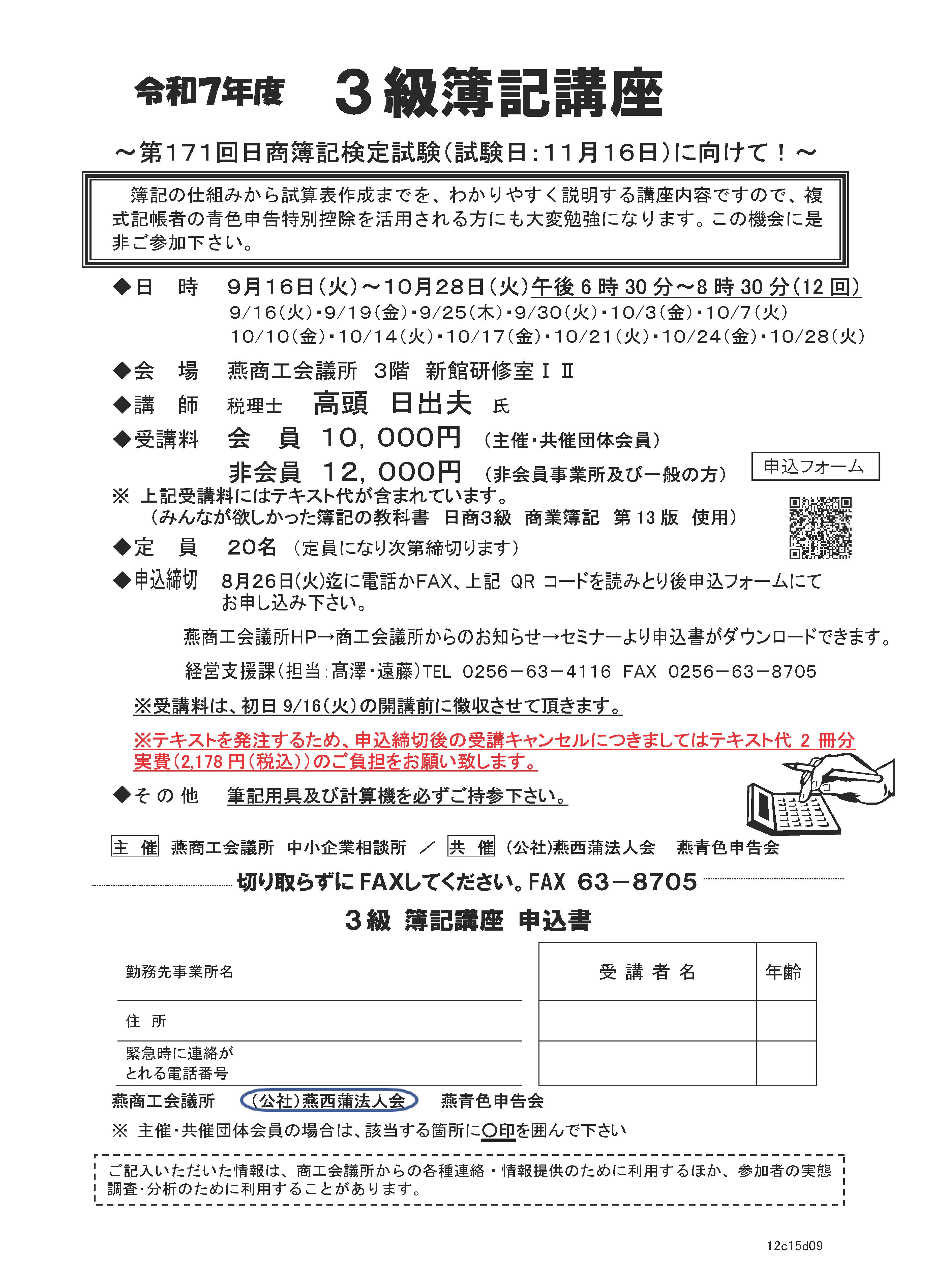 ◆令和7年度 3級簿記講座テーマ「~第171回日商簿記検定試験(試験日:11月16日)に向けて!~」 |